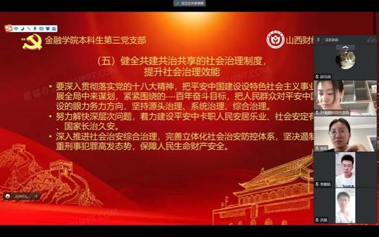 “安而不忘危,存而不忘亡,治而不忘乱。我们必须 保持清醒头脑、强化底线思维,有效防范、管理、处理国 家安全风险,有力应对、处置、化解社会安定挑战。”本科生第三党支部预备党员张拓讲到。随后,她给支部成员们分享了主题为《坚持人与自然和谐共生,坚决维护国家安全和社会稳定》的学习心得——“促进人与自然和谐共生,彰显了我们尊重自然顺应自然保护自然的生态文明理念,彰显了中国共产党以人民为中心的价值底色,彰显了我们坚定不移走生产发展、生活富裕、生态良好的文明发展道路的决心和信心,从天人合一到人与自然和谐共生。青绿千载,山河无垠。习近平总书记"绿水青山就是金山银山的理念"已经深入人心,并且融入到我们的政策制度和文化中。没有人不喜欢绿水青山,没有人不想要绿水青山。”