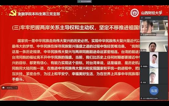 会议最后,本科生第三党支部邱马玥讲到:“一个强大的国家离不开一支强大的军队,也离不开领土完整。我们每个人都应该坚决维护国家的统一,将自身的命运与国家命运紧密相连,将自己梦想汇入时代的洪流,为实现中华民族的伟大复兴去努力奋斗。”会议最后,本科生第三党支部邱马玥如是讲道。
