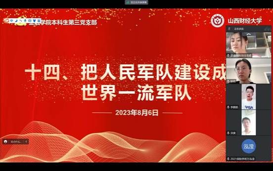 概要:继上次本科生第三党支部预备党员张拓带领大家学习第十二章和第十三章的内容后,在8月6日进行了第十四章和第十五章的学习,本讲的主要内容是“把人民军队建设成为世界一流军队”和“坚持和完善‘一国两制’推进祖国统一”,本讲由本科生第三党支部预备党员任思奇带领大家学习,本科生第三党支部邱马玥主持并总结发言。