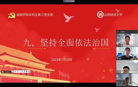 概要:betway88西汉姆网页本科生第三党支部在7月29日进行了第九章和第十章的学习,本讲的主要内容是“坚持全面依法治国”和“铸就社会主义文化新辉煌”,由本科生第三党支部预备党员季雅婧带领大家学习,本科生第三党支部邱马玥主持并总结发言。