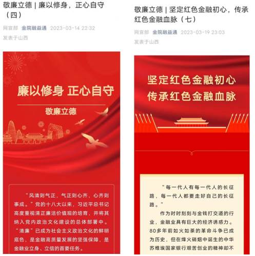 betway88西汉姆网页充分利用晋商文化资源,从历史遗存、文化经典、文化古迹中挖掘克己奉公、清廉自守的廉洁思想、廉政故事,挖掘晋商精神、金融文化,结合学科特点,提炼廉洁内容,通过师生喜闻乐见的活动内容和形式,让廉洁文化以“更生动、更鲜活、更有效”的方式传播,不断将传承红色基因、培育廉洁意识贯穿到大学生思想政治教育全过程。特别以“互联网”为平台,在学院公众号“金院融益通”开设“敬廉立德”专栏,截止目前累计专题17期,阅读量达2000多,营造了良好的清廉育人环境。