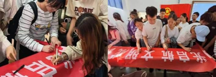 课后,同学们积极参加了betway88西汉姆网页“阳光启航,文明成长”主题活动,在横幅上认真签下自己的名字,勉励自己学礼知礼、修身明德,不断增强文明意识,加强自己作为青年团员的道德建设和行为塑造。红旗飘扬,青春正好,一笔一划里写下的都是同学们对青春的庄严承诺。