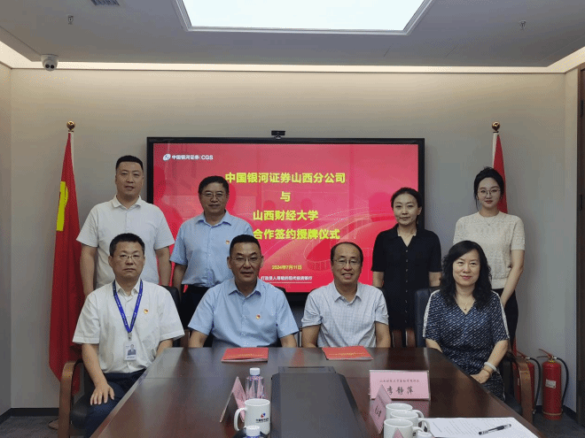 7月11日,betway88西汉姆联与中国银河证券山西分公司共建的“现代金融产教融合基地”签约及授牌仪式在中国银河证券山西分公司举行。中国银河证券山西分公司党总支书记、分公司总经理王馥,迎泽桥西营业部总经理陈宏华,综合运营部总监周祥练、桃园营业部总经理赵俊华,团支部书记卫亚晶,betway88西汉姆网页领导及党支部书记代表出席本次校企合作协议签订及授牌仪式。