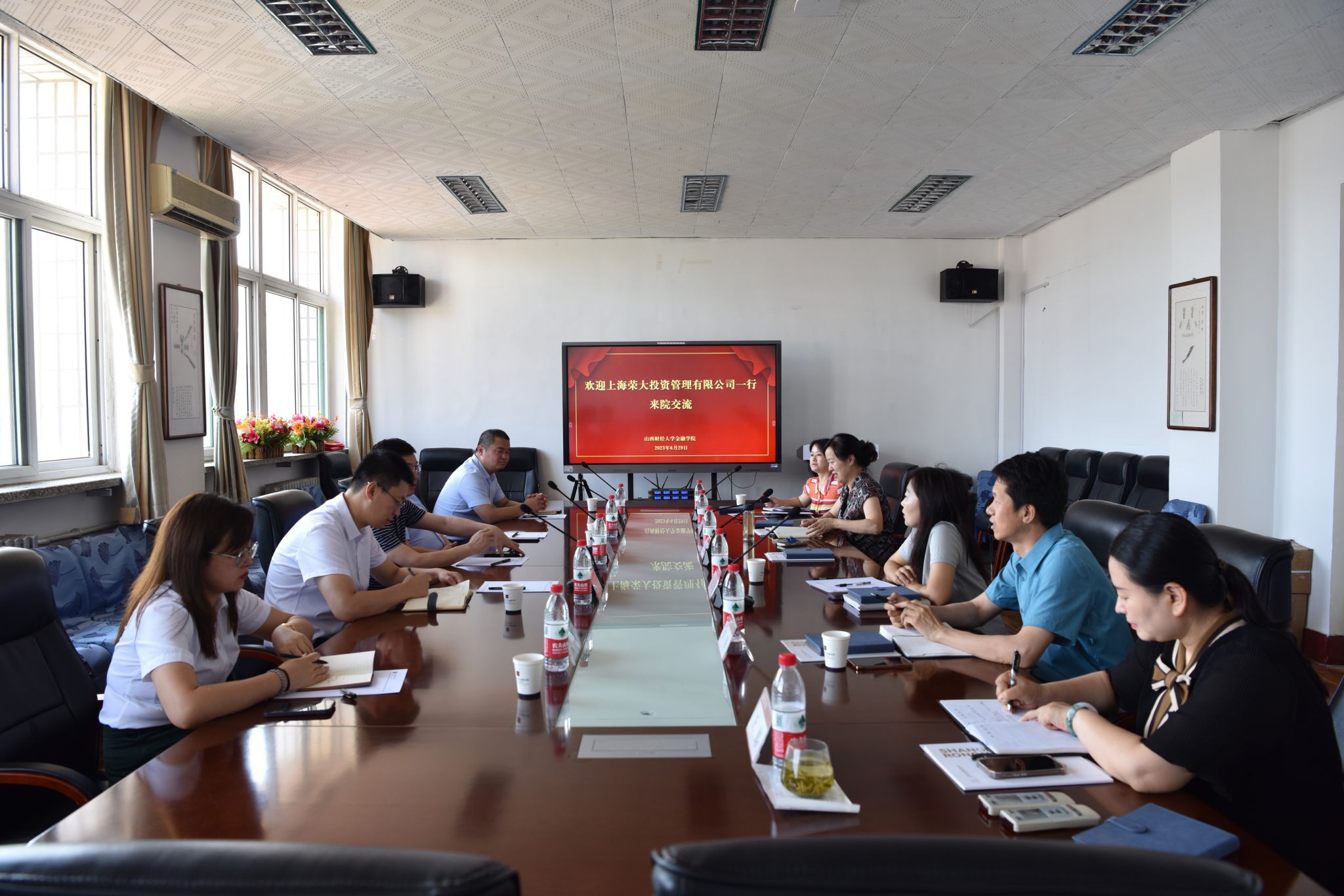 杜爱民董事长介绍了荣大公司“深化产融结合、赋能实体发展”的工作宗旨,以投促产、以融促产的职能定位和打造行业领先的产融服务平台的美好愿景,希望与betway88西汉姆网页建立校企合作机制,推动地方经济发展和落地人才就业打造系列平台。李喜明(98计统校友)和孔繁强(02金融校友)副总经理分别介绍了荣大公司目前与国内高校产学研合作的具体情况,表扬了我院毕业生在该公司财务、金融板块等岗位发挥着重要作用,希望与我院在科研项目合作、人才学历和业务能力提升等方面构建合作机制。郭金涛副总经理表示公司将集中优势资源,拿出最大诚意,为学院师生实习实训和就业提供广阔的舞台。