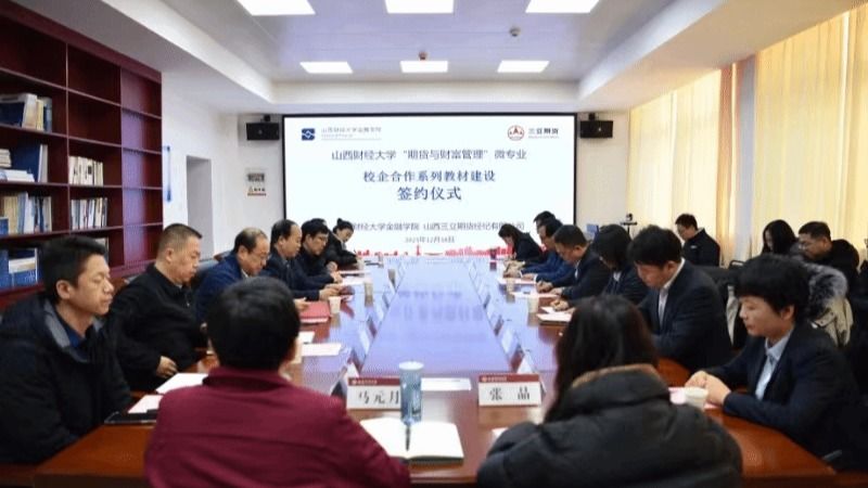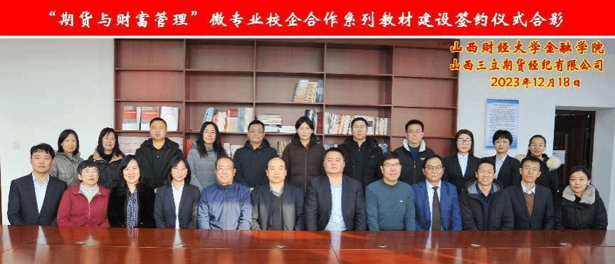 2023年12月18日上午,“期货与财富管理”微专业校企合作系列教材建设签约仪式在修德楼705室举行。betway88西汉姆联党委常委、副校长沈沛龙、山西三立期货经纪有限公司董事长兼总经理李旭、校教务部部长张文龙、betway88西汉姆网页党政领导班子及教研室主任、山西三立期货公司高管及相关部门负责人等20余人参加,此次签约仪式旨在加强双方在期货教育领域的合作,共同推动期货人才的培养。