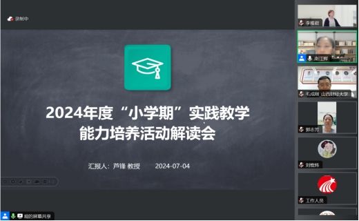 本次解读会共有7项议程。会议第一项,副院长芦锋教授从背景介绍、学生参与方式、各年级实践主题、带队老师介绍、时间安排、实践项目类别、如何选择实践项目、院级实践项目报名方式、安全措施以及答疑解惑等10个方面向同学们全面解读了学校、学院2024年度“小学期”实践能力培养活动。