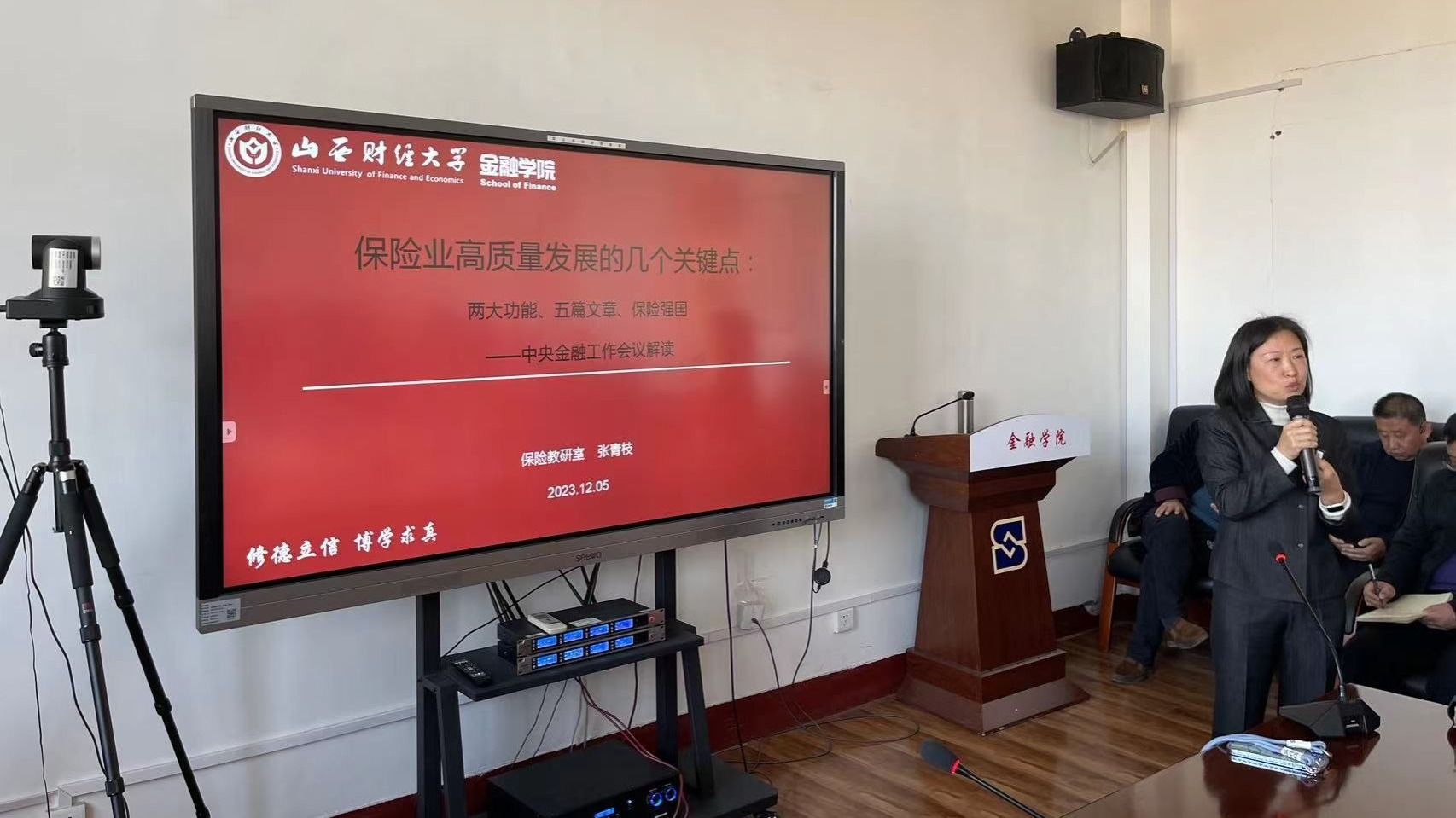 2023年12月5日下午,保险教研室副主任张青枝副教授以“保险业高质量发展的几个关键点:两大功能、五篇文章、保险强国”为题做中央金融工作会议解读分享,学院全体教师参加。